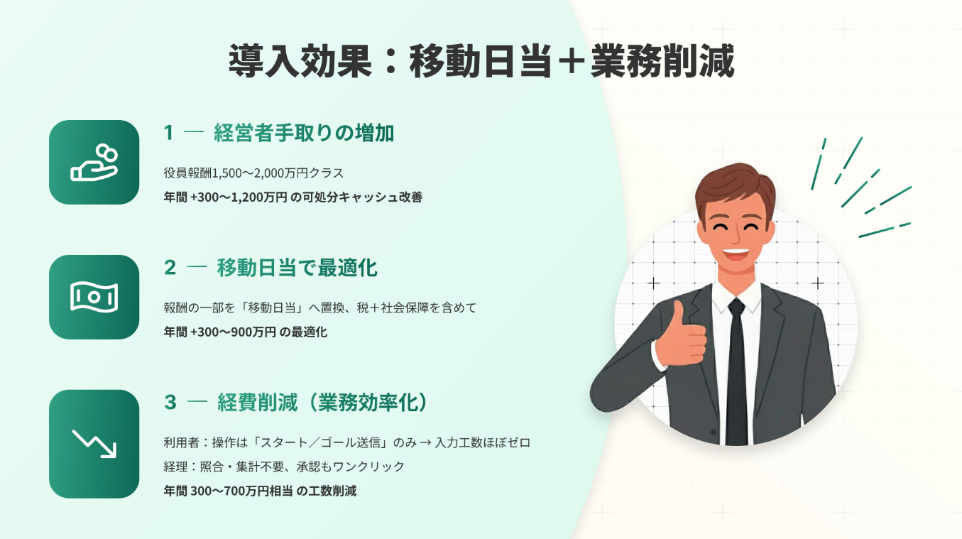 「やらせ出張」や架空日当を技術的に防止。実際の移動と連動した支給で透明性を確保します。